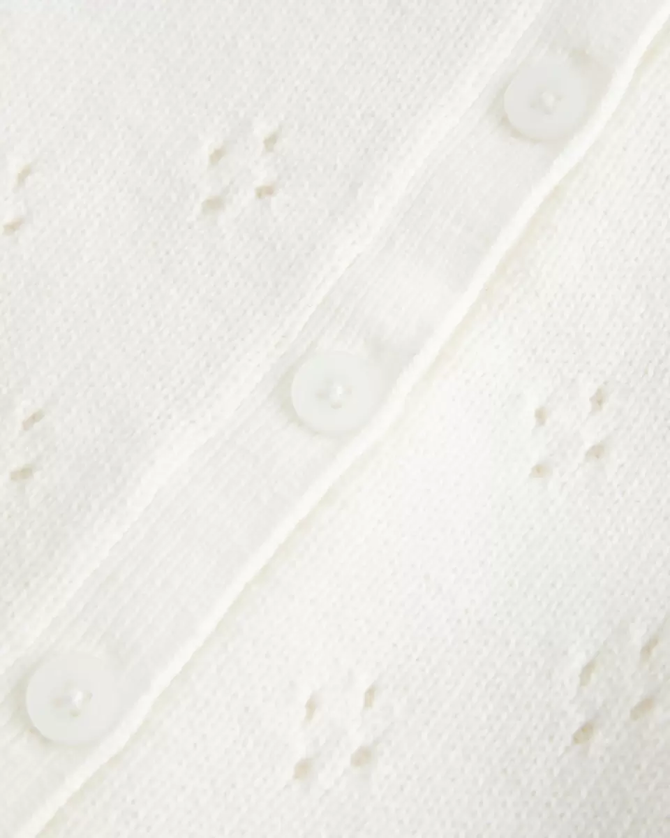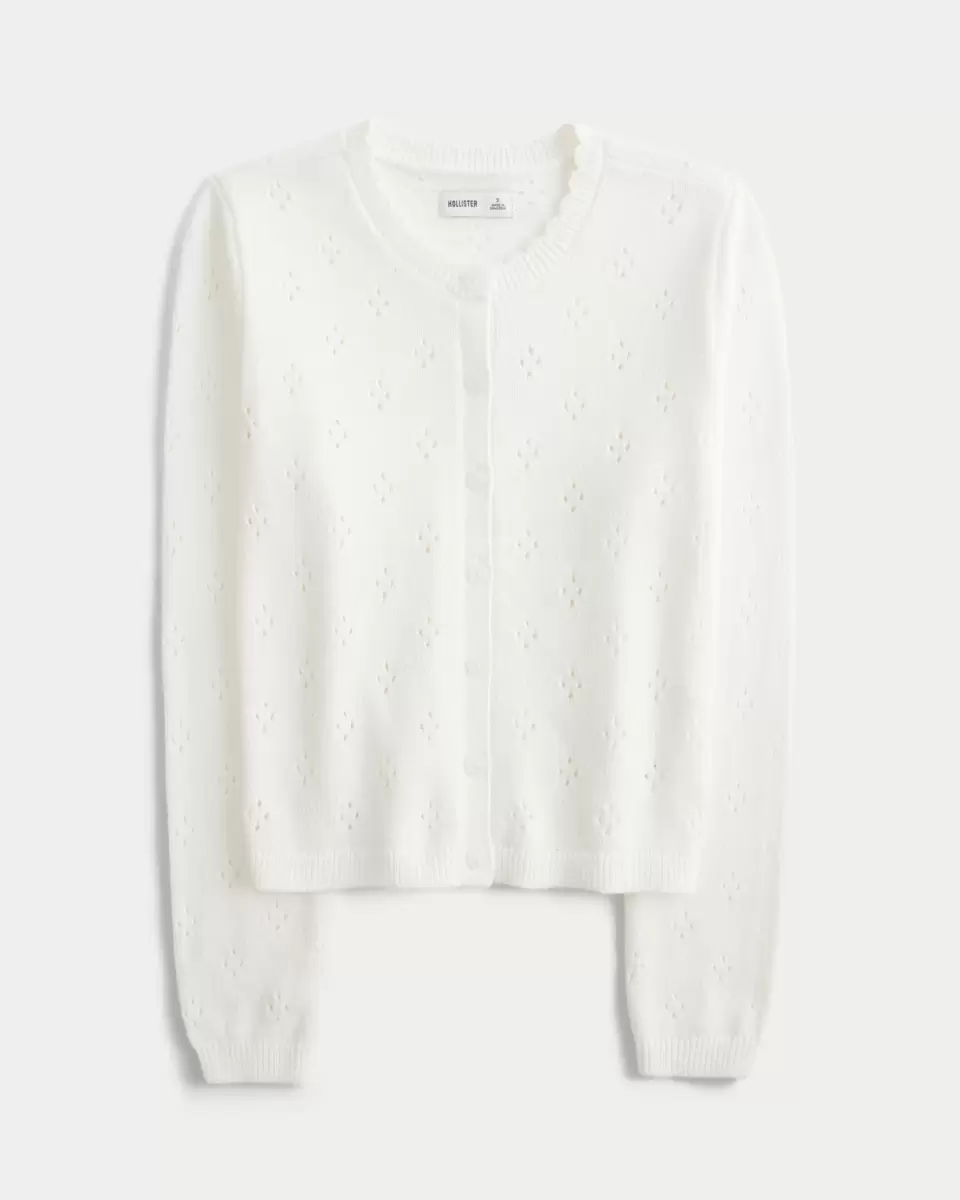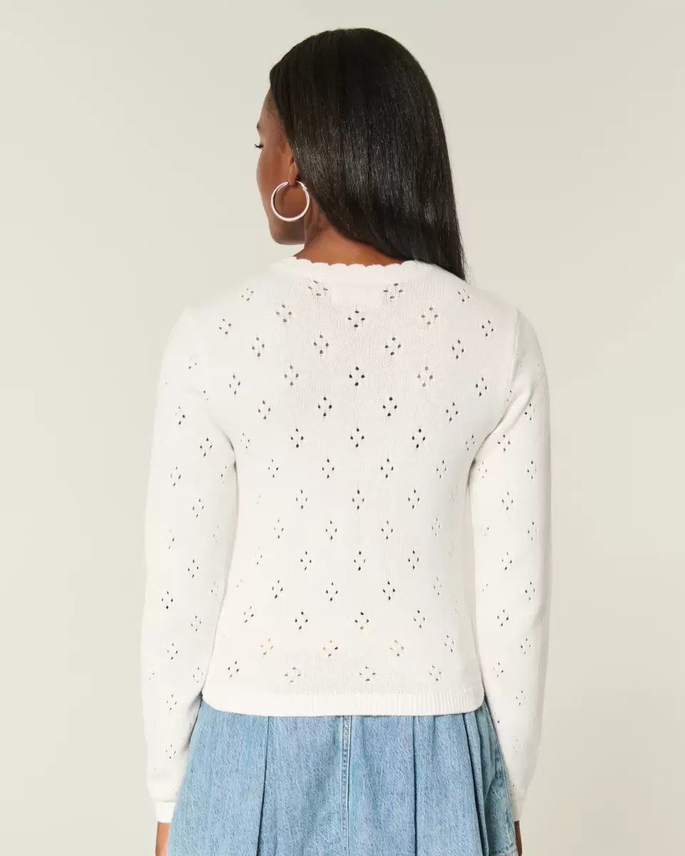 A cozy and super soft cardigan with pretty all-over eyelett patterns and a scalloped crew neckline. Full button closure, ribbed trims, long sleeves. Imported.