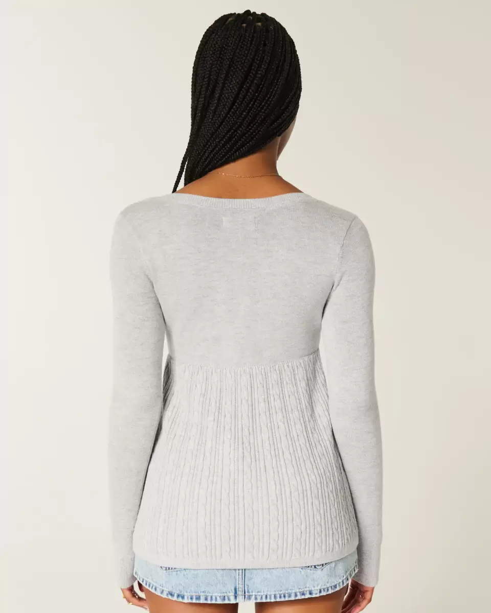 Perfect for layering with a cami or on its own, this long-sleeve sweater is designed with a square neckline and cute Y2K-inspired babydoll silhouette. Front button closure, cable-knit patterns, longer length. Easy Fit. Imported.