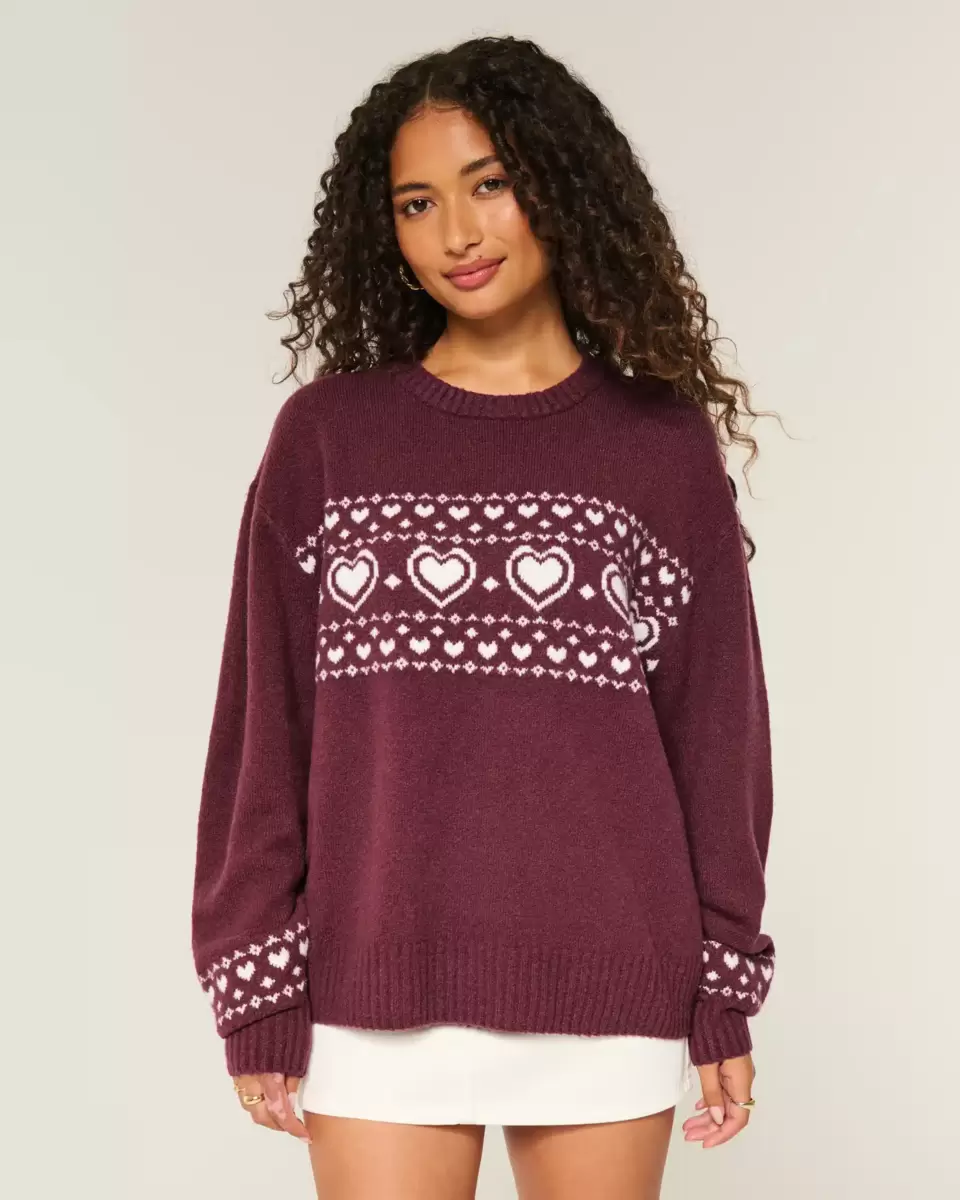 A super soft and cozy knit sweater featuring a classic heart pattern. Crew neckline, long sleeves, ribbed trims. Oversized Fit. Imported.