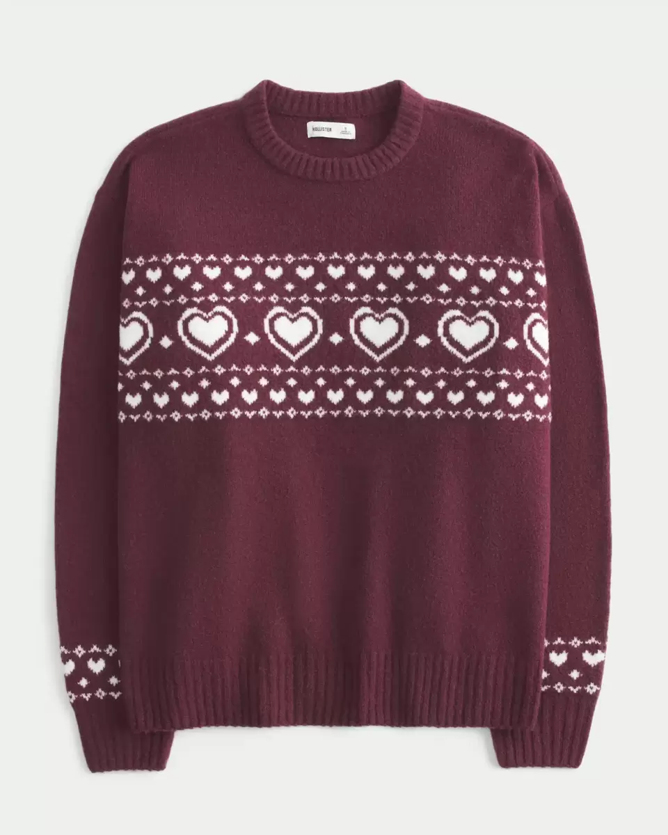 A super soft and cozy knit sweater featuring a classic heart pattern. Crew neckline, long sleeves, ribbed trims. Oversized Fit.