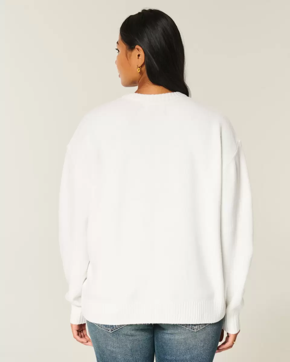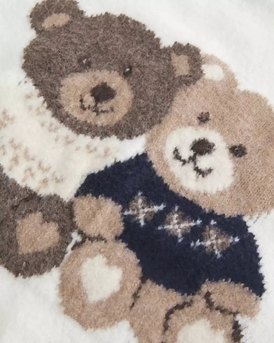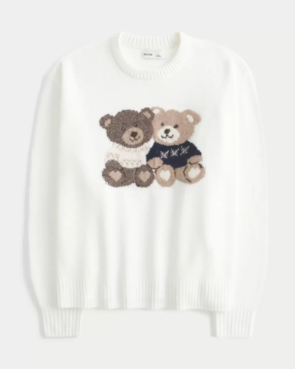 A super soft and cozy knit sweater featuring a cute teddy bear intarsia graphic. Crew neckline, long sleeves, ribbed trims. Oversized Fit. Imported.
