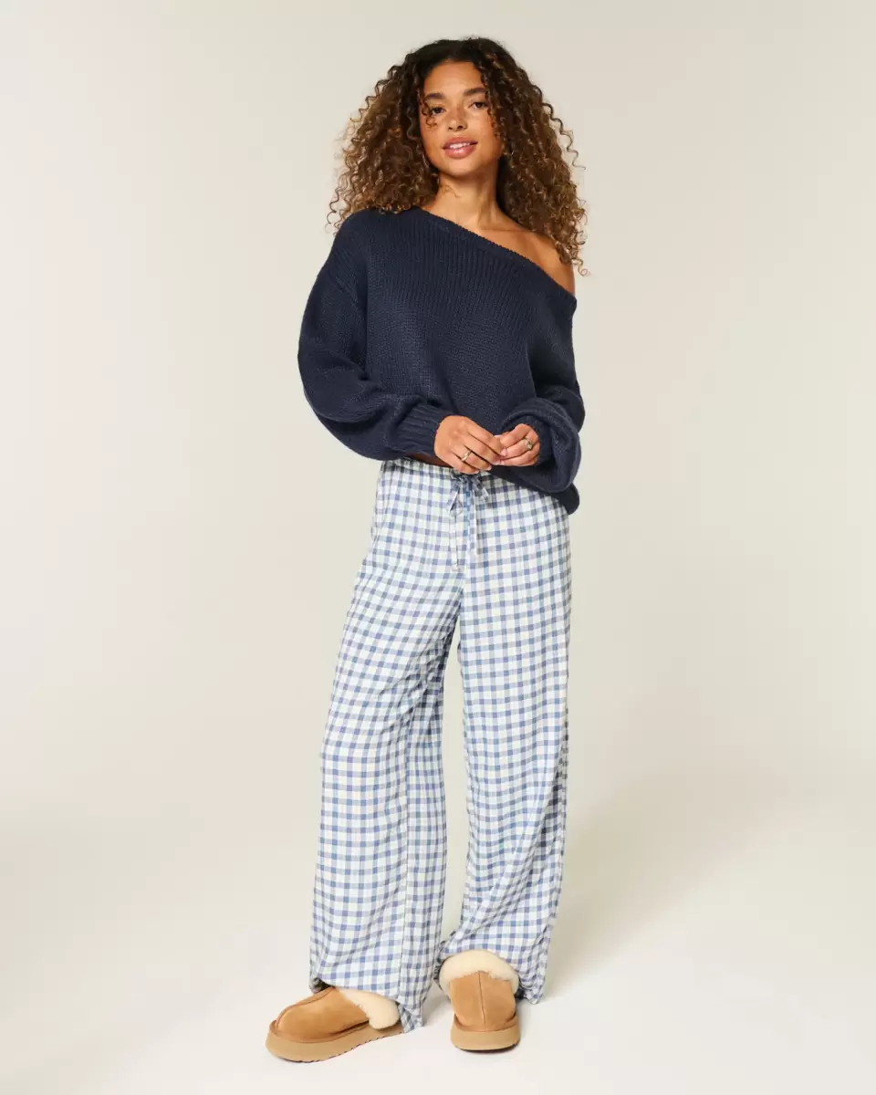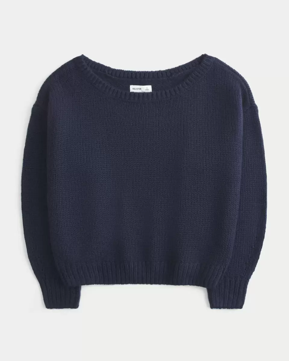 A cozy and super soft sweater designed with a slouchy silhouette and off-the-shoulder neckline. Long sleeves, ribbed trims. Imported.